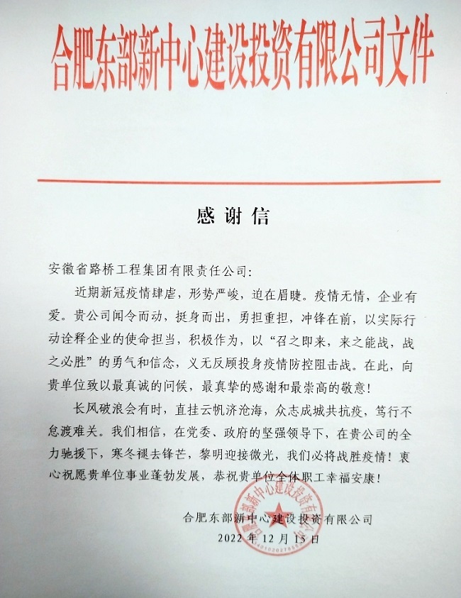 近日,合肥東部新中心建設投資有限公司發來感謝信,對安徽路橋集團在疫情形勢嚴峻復雜的非常階段,主動擔當作為、夜以繼日奮戰在瑤海區防疫第一線,給予高度的贊揚和衷心感謝。