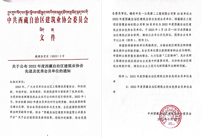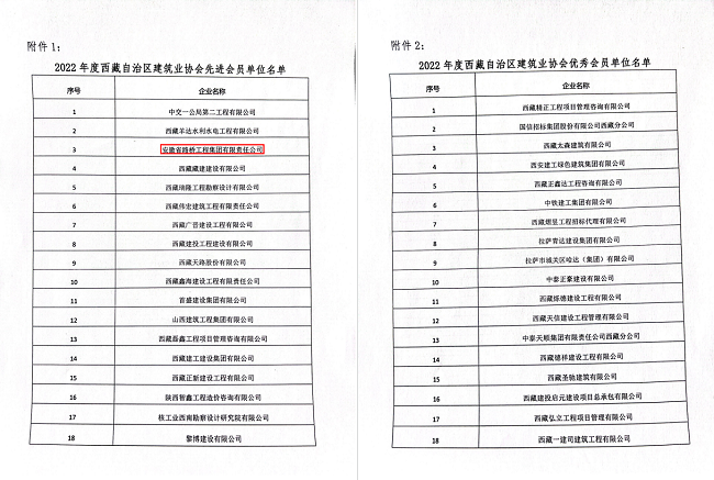 近日,西藏自治區(qū)建筑業(yè)協(xié)會黨委通報(bào)表彰2022年度先進(jìn)及優(yōu)秀會員單位,安徽路橋集團(tuán)被授予“先進(jìn)會員單位”榮譽(yù)稱號,這是公司連續(xù)三年獲此殊榮。