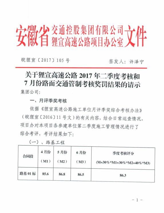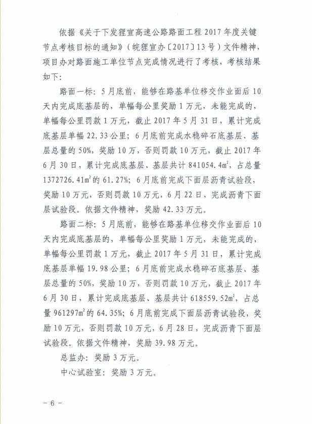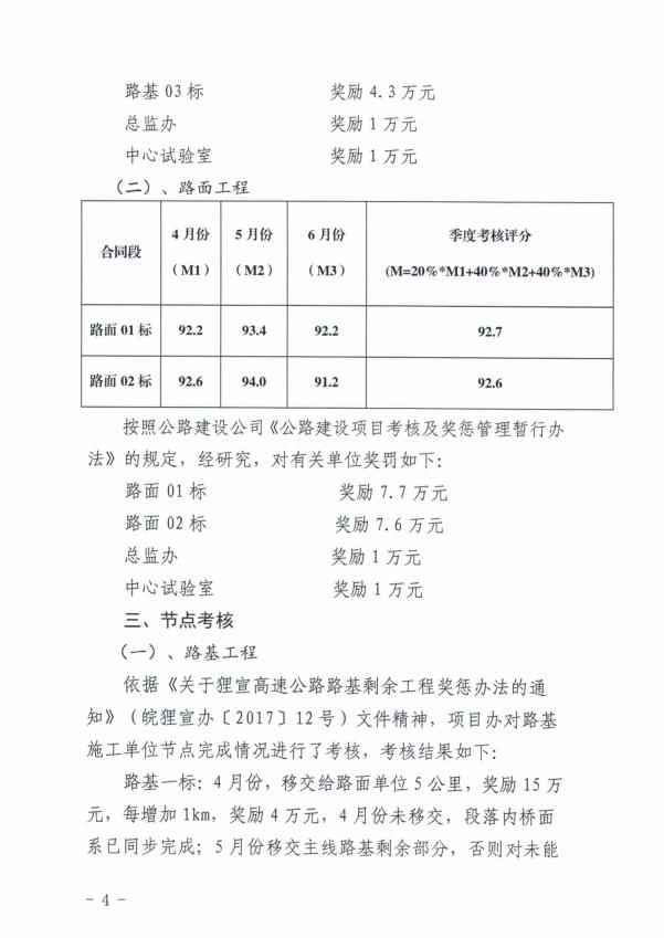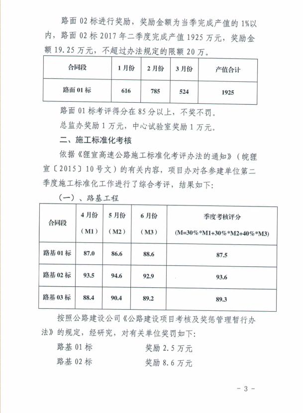 貍宣路面02標第二季度完成產(chǎn)值1925萬,獲業(yè)主獎勵19.25萬,標準化建設考核獎勵7.6萬元,關鍵節(jié)點考核獎勵39.98萬,交通管制獎勵2萬元,累計獲獎勵68.83萬元,位列貍宣項目綜合考評第一名。
