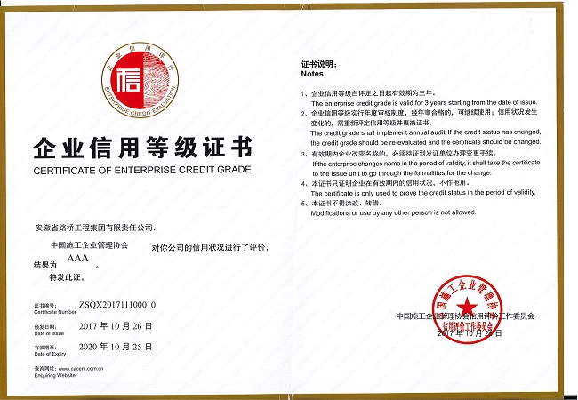 今年5月,在公司領(lǐng)導(dǎo)的高度重視下,公司組織申報2017年度工程建設(shè)社會信用企業(yè),申報材料包括公司近年來的發(fā)展戰(zhàn)略、市場開拓、質(zhì)量安全現(xiàn)狀、人力資源配置、管理能力、設(shè)備、財務(wù)等各類信息。8月份,中施企協(xié)信用評價專家組一行蒞臨我公司實地訪談,詳細(xì)了解我公司管理情況。通過實地訪談,各位專家一致認(rèn)為我公司安全、質(zhì)量、科技創(chuàng)新、環(huán)保增效、企管和規(guī)劃等內(nèi)容滿足AAA級企業(yè)的評價標(biāo)準(zhǔn)。最終,公司以較高的評審分值,通過中施企協(xié)全國信用評價AAA級年度審核,獲評中施企協(xié)企業(yè)信用評價AAA級信用企業(yè)。
