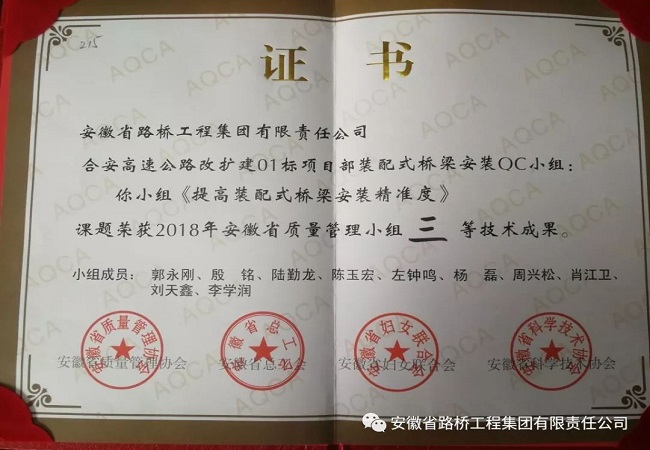 由公司選送的《提高裝配式橋梁安裝精準度》 QC小組課題榮獲2018年安徽省質量管理小組三等技術成果。裝配式橋梁尚屬于公路橋梁施工研究階段,此次QC小組活動成功解決墩柱安裝存在的主要問題,為后續裝配式橋梁施工提供了良好的施工經驗,贏得了業主和監理單位的好評,提升了企業形象,取得了良好的社會效益。