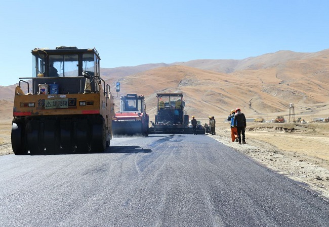 次日上午10點國道219線薩嘎縣至康馬縣段改建工程第一合同段項目正式進入瀝青試驗段施工,試驗段施工樁號K1+950-K2+150,王俊文親臨一線,指導該項目瀝青試驗段施工。