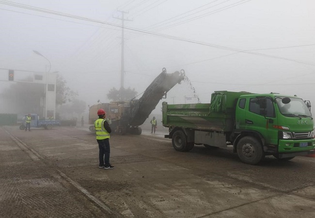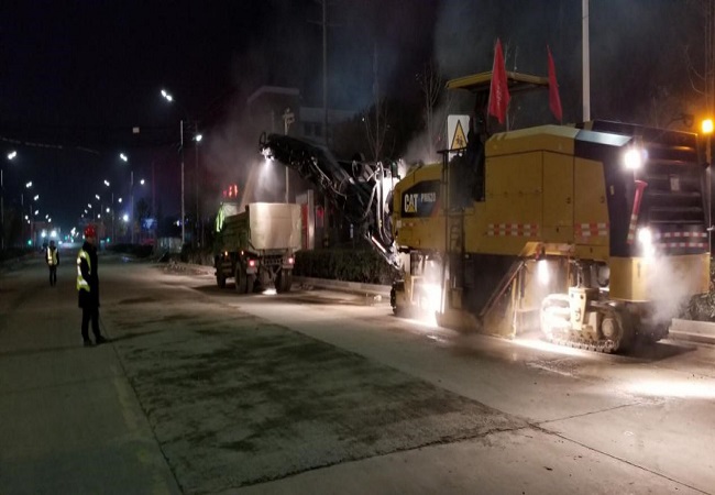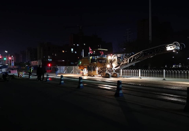 晚上,悠悠黑夜,路上仍是燈火通明,機(jī)聲轟隆,項(xiàng)目員工仍堅(jiān)守在施工一線,搶打最后一個(gè)交叉路口的混凝土,銑刨最后一段機(jī)動(dòng)車道的路面,無畏寒冷與困意。