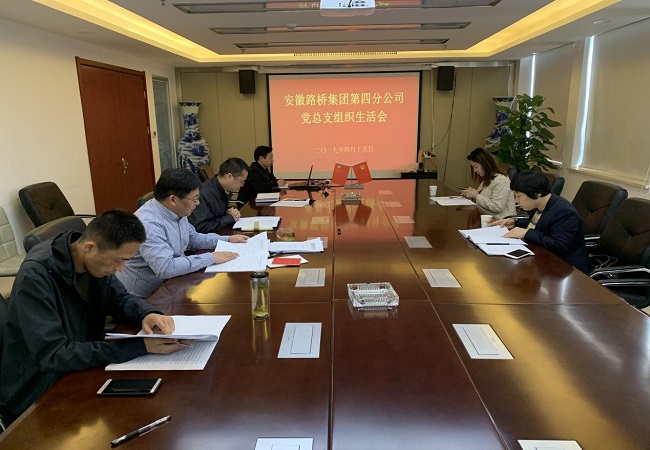 根據公司黨委《關于召開2018年度基層黨組織組織生活會和開展民主評議黨員的通知》(路橋集黨發〔2019〕5號)文件精神,4月15日下午,四分公司黨總支在企融國際大廈16樓會議室召開了2018年度組織生活會。會議由黨總支書記朱大俊主持,四分公司黨總支班子參加會議。公司財務總監鄧蕾應邀到會指導。