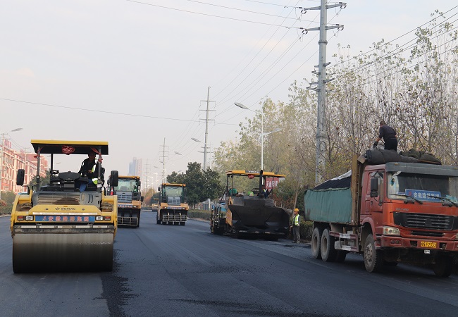 攤鋪現(xiàn)場,2臺(tái)攤鋪機(jī)緩緩移動(dòng),6臺(tái)壓路機(jī)來回穿梭,機(jī)器轟鳴,現(xiàn)場施工人員緊張忙碌,各司其職,呈現(xiàn)出熱火朝天的大干局面。據(jù)悉,本次為子胥大道(富強(qiáng)路-淝河大道)機(jī)動(dòng)車道上面層瀝青攤鋪,道路全長1.2公里,寬22米,攤鋪厚度4公分,截止到11月24日已全部攤鋪完成。