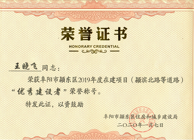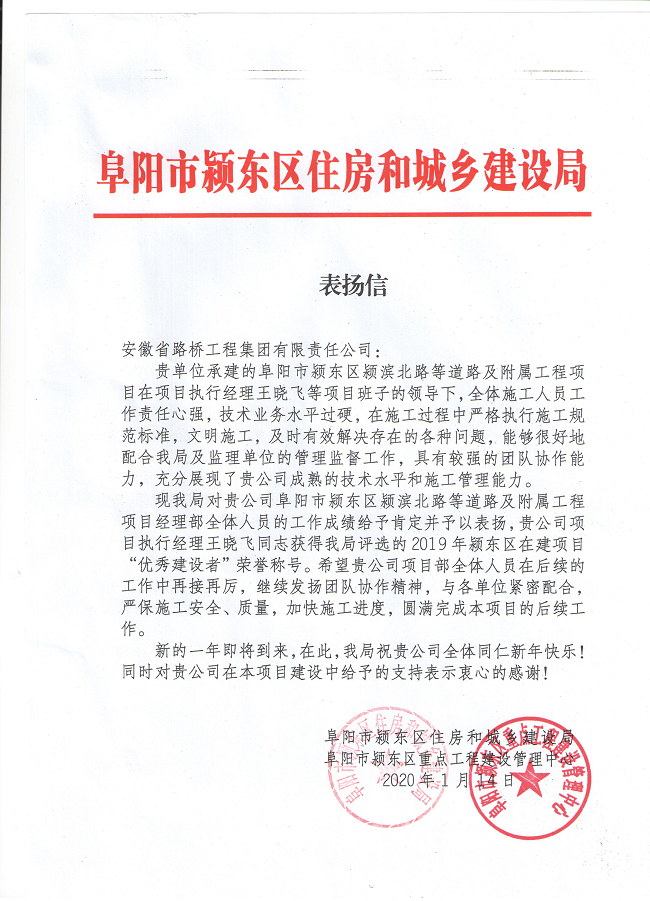 1月14日,安徽路橋集團(tuán)五分公司阜陽(yáng)潁東區(qū)道路項(xiàng)目收到阜陽(yáng)市潁東區(qū)住建局和區(qū)重點(diǎn)工程建設(shè)管理中心聯(lián)合發(fā)來(lái)的表?yè)P(yáng)信。業(yè)主單位在信中對(duì)阜陽(yáng)潁東區(qū)道路項(xiàng)目經(jīng)理部在施工過(guò)程中表現(xiàn)的團(tuán)隊(duì)協(xié)作精神、專業(yè)技術(shù)水平及施工管理能力給予了高度贊揚(yáng),對(duì)路橋集團(tuán)在項(xiàng)目建設(shè)中給予的支持表示衷心的感謝。項(xiàng)目部生產(chǎn)副經(jīng)理王曉飛同志榮獲住建局評(píng)選的2019年度阜陽(yáng)潁東區(qū)在建項(xiàng)目“優(yōu)秀建設(shè)者”榮譽(yù)稱號(hào)。