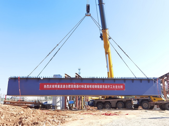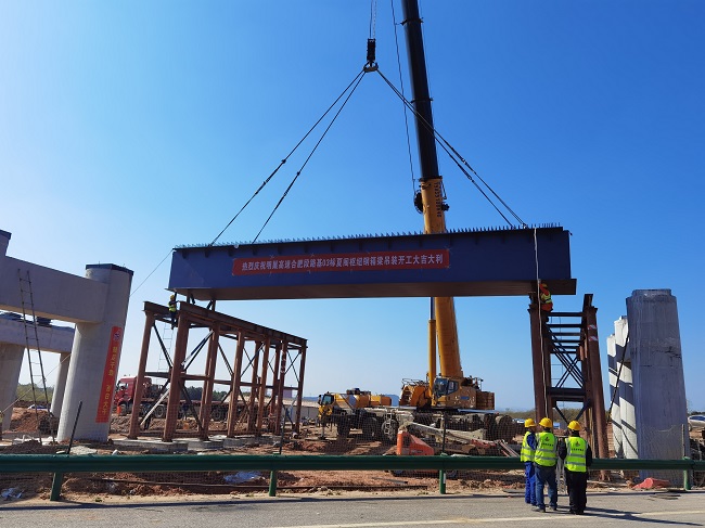 11月11日上午12點28分,隨著第一片鋼箱梁的順利架設就位,明巢高速合肥段夏閣樞紐橋梁進入上部結構施工階段,這也是明巢高速合肥段首座跨線橋進入上部結構施工。