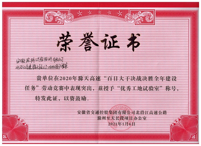 1月6日,在北沿江高速公路滁州至天長段項目辦舉辦了2020年“百日大干決戰(zhàn)決勝全年建設任務”勞動競賽評優(yōu)表彰大會,安徽省路橋試驗檢測有限公司北沿江高速公路滁州至天長段CT-04M02標(簡稱:滁天高速04標工地試驗室)工地試驗室獲得“優(yōu)秀工地試驗室”榮譽稱號,成為全標段8個工地試驗室中唯一的一個優(yōu)秀工地試驗室。