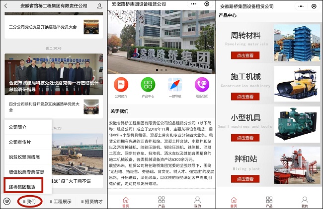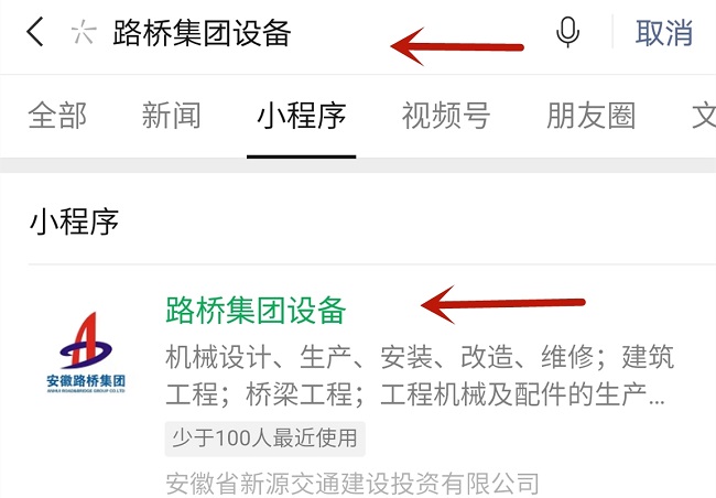 用戶可在微信小程序中添加“路橋集團(tuán)設(shè)備”即可進(jìn)入小程序主頁(yè),或者進(jìn)入公司公眾號(hào)后,點(diǎn)擊左下角“我們”后,進(jìn)入“路橋集團(tuán)設(shè)備”,即可進(jìn)入小程序主頁(yè)。