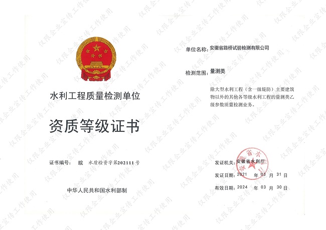 3月31日,經安徽省水利廳審查核發,安徽省路橋試驗檢測有限公司正式獲批水利工程質量檢測單位量測類乙級資質,成功進入水利工程質量檢測系統,成為安徽省檢測機構中為數不多的同時具有交通、水利行業檢測資質的企業。