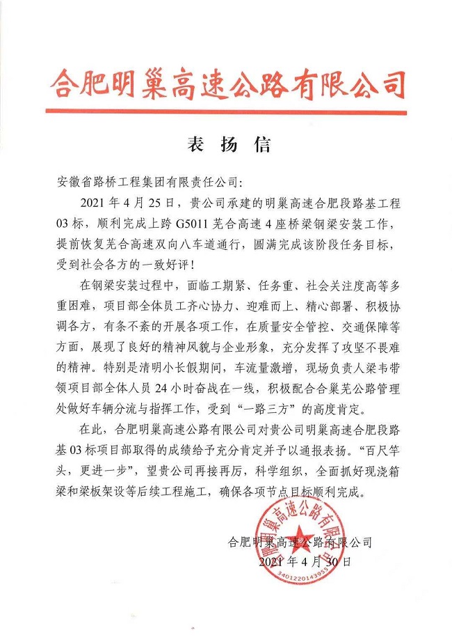 蕪合高速是我省東南沿海地區的重要干線公路,車流量大且車速快,備受業主單位、高速管理處等社會各界的高度關注,公司領導多次親臨現場,指揮工作。在多方大力支持下,面對工期緊、任務重、導改難度大等困難,項目部全體人員化壓力為動力,弘揚路橋集團人“特別能吃苦、特別能戰斗”的優良作風,立足安全、嚴控質量、狠抓進度,團結一致,不畏艱難,提前圓滿完成既定的鋼箱梁架設節點目標,使整個夏閣樞紐施工進入全新局面,并得到了明巢公司的充分肯定并予以通報表揚。