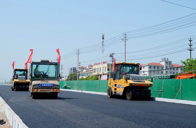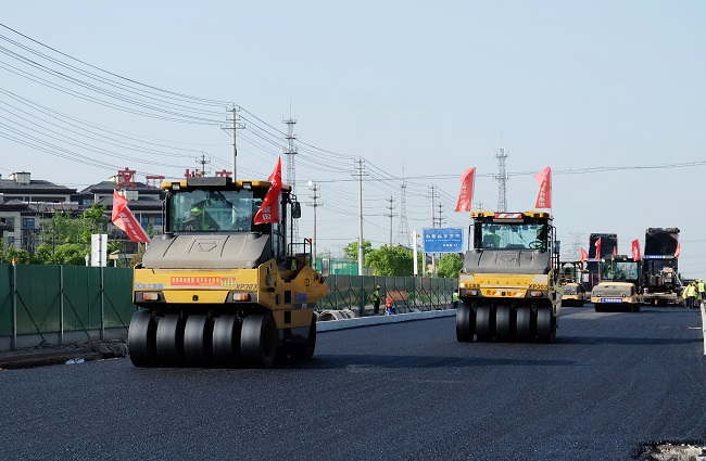 5月8日,繁華大道改造工程項目K1+160-K2+400的施工現場,伴隨著壓路機緩緩壓過路面,一條平整的瀝青路面如同黑色緞帶,在水穩基層上慢慢延展。繁華大道項目瀝青混合料面層攤鋪正式啟動,為確保10月1日主車道通車目標打下堅實的基礎。
