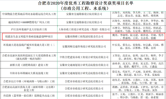 6月21日,合肥市優(yōu)秀工程勘察設(shè)計獎評選結(jié)果正式公布,路橋集團(tuán)設(shè)計總院申報的“績溪縣生態(tài)文明提升基礎(chǔ)設(shè)施建設(shè)PPP項目”獲得2020年度優(yōu)秀工程勘察設(shè)計獎市政公用工程類三等獎。