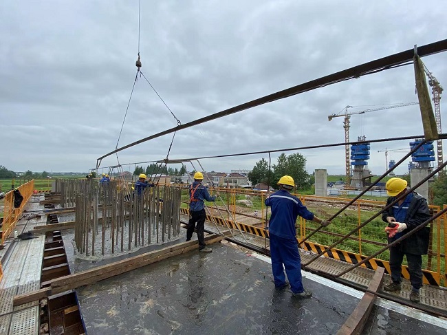 在開(kāi)工前,項(xiàng)目部精心組織,合理安排。相關(guān)技術(shù)人員進(jìn)行了支撐平臺(tái)的的專(zhuān)項(xiàng)驗(yàn)收,科學(xué)布控施工組織,在原材、配合比、運(yùn)輸、布料方法、澆筑速度等環(huán)節(jié)嚴(yán)格把控,安排專(zhuān)人全程監(jiān)測(cè)支撐平臺(tái)。由于受場(chǎng)地地基基礎(chǔ)限制,施工難度較大,項(xiàng)目部技術(shù)人員克服困難、潛心鉆研,反復(fù)驗(yàn)算推演,采用穿心棒法進(jìn)行施工。在澆筑過(guò)程中,工人協(xié)作緊密,有條不紊地進(jìn)行蓋梁澆筑作業(yè),技術(shù)人員密切關(guān)注澆筑過(guò)程中的每個(gè)細(xì)節(jié),認(rèn)真指導(dǎo),及時(shí)優(yōu)化調(diào)整施工中出現(xiàn)的問(wèn)題。