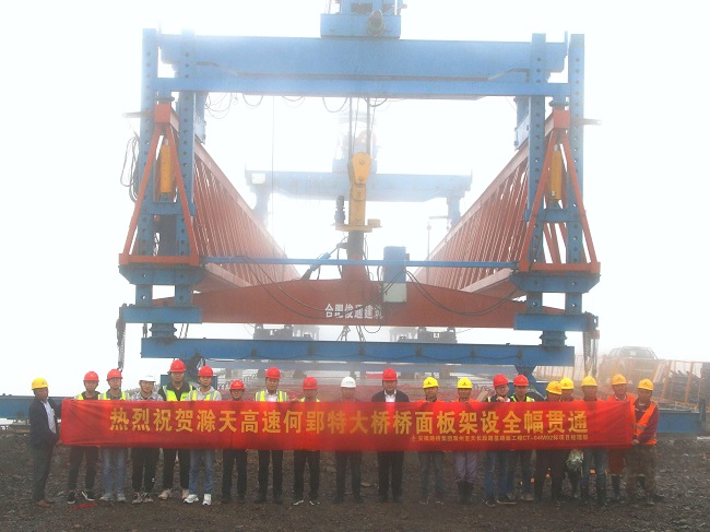 10月13日,滁天高速04標何郢特大橋最后一片橋面板順利吊裝到位,至此何郢特大橋橋面板架設全幅貫通,標志著滁天高速04標橋梁工程全部轉入橋面施工新階段。