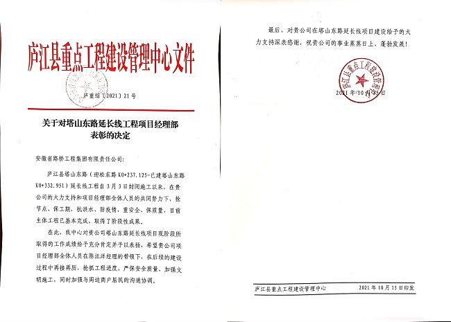 10月15日,廬江縣重點工程建設管理中心發來喜報,對路橋集團五分公司承建的廬江縣塔山東路延長線項目所取得的工作成績給予充分肯定并予以表揚。