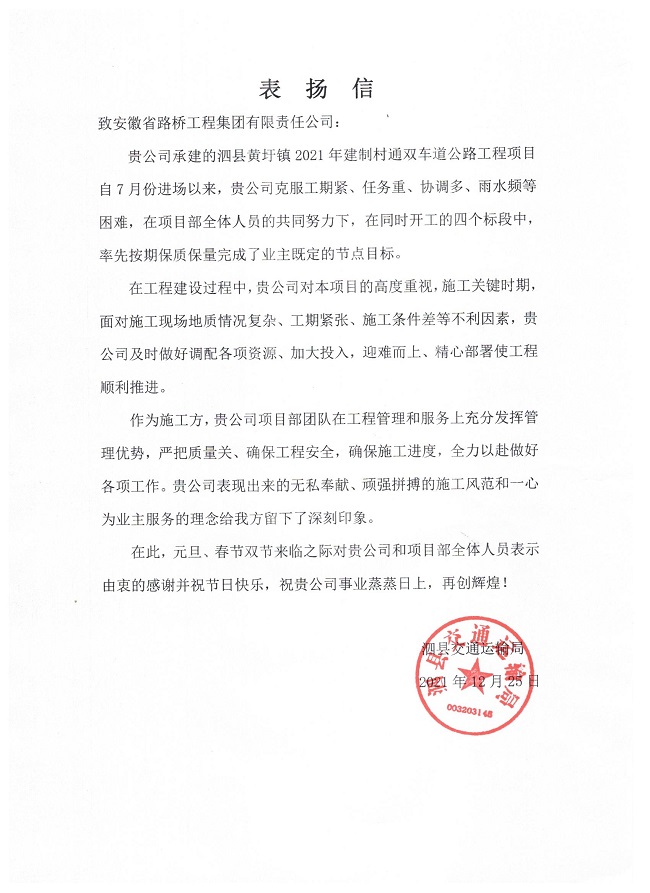 12月25日,六分公司泗縣黃圩鎮項目收到泗縣交通運輸局發來的表揚信。信中對項目部展現出的無私奉獻、頑強拼搏的施工風范和一心為業主服務的理念提出高度贊揚。
