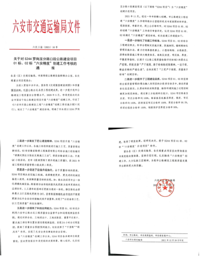 經過一年半的精心創建, 2021年11月,244項目部迎來了六安市“六安精度”工作領導組辦公室的審查評定,經過材料審查、現場復核、考察評定、網上公示等環節,領導組一致認定S244羅崗至分路口段公路工程02標項目滿足“六安精度”建設標準。經六安市交通運輸局研究決定,授予S244羅崗至分路口段公路工程02標項目“‘六安精度’示范項目”稱號。