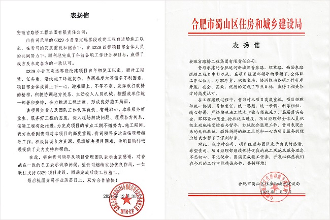 近日,我公司承建的G329小普至定遠(yuǎn)界段改建項(xiàng)目,合肥運(yùn)河新城酒香泉路、紹章路、西湯泉路道路工程項(xiàng)目先后榮獲業(yè)主來(lái)信表?yè)P(yáng),兩項(xiàng)目業(yè)主對(duì)我公司項(xiàng)目高標(biāo)準(zhǔn)、高質(zhì)量完成節(jié)點(diǎn)任務(wù)予以高度認(rèn)可和贊揚(yáng),對(duì)公司以及項(xiàng)目管理團(tuán)隊(duì)表示衷心的感謝。