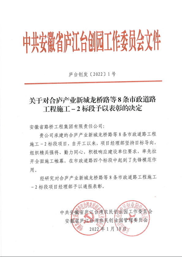 近日,中共安徽省廬江臺(tái)灣農(nóng)民創(chuàng)業(yè)園工作委員會(huì)和安徽省廬江臺(tái)灣農(nóng)民創(chuàng)業(yè)園管理委員會(huì)向安徽路橋集團(tuán)合廬產(chǎn)業(yè)新城龍橋路等8條市政道路工程施工-2標(biāo)段項(xiàng)目發(fā)來(lái)表彰信,對(duì)項(xiàng)目率先拉開(kāi)全面施工帷幕,在市政道路四個(gè)標(biāo)段中起到先鋒模范作用予以表彰。