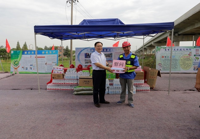 錢總一行來到項部施工現場看望和慰問奮戰在施工一線干部職工,為廣大職工送去藥品、飲料等防暑降溫物品。錢總對安徽路橋集團廣大職工戰高溫、斗酷暑,堅持在一線施工的艱苦奮斗精神給予高度贊揚,對項目部現階段工作給予了肯定,要求項目部要進一步加強管理,做好夏季施工防暑降溫工作,優質高效推進工程建設。
