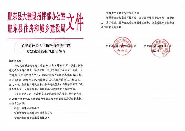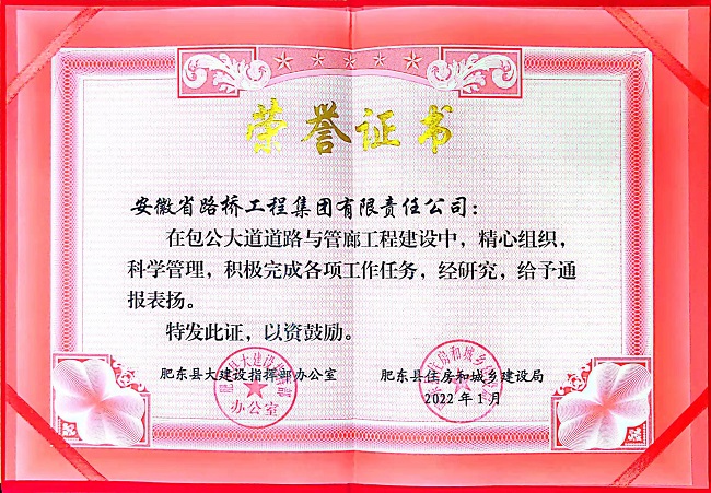 2022年1月20日,肥東縣大建設指揮部辦公室、肥東縣住房和城鄉建設局向安徽路橋集團發來表揚信,對包公大道項目為肥東縣大建設作出的積極貢獻給予表揚。