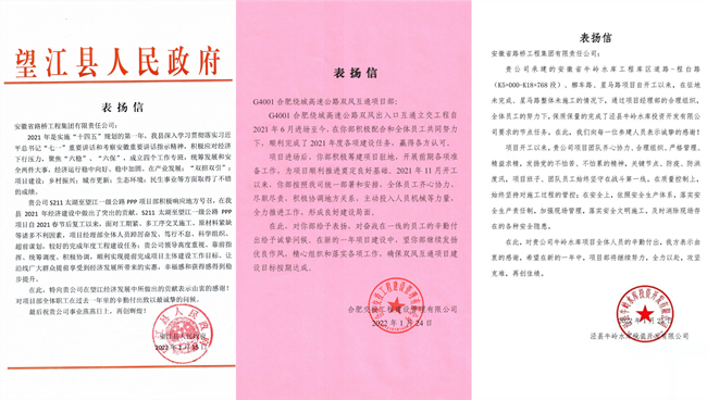 表揚信中指出,S211PPP在項目建設中,自2021年春節(jié)復工以來,項目部面對工期緊、多工序交叉施工、原材料緊缺等諸多不利因素,全體人員踔厲奮發(fā),篤行不息、科學組織、超前謀劃,較好的完成年度工程建設任務,積極履行國企責任,順利實現(xiàn)提前完成項目主體建設工作目標,讓沿線廣大群眾提前享受到經(jīng)濟發(fā)展所帶來的的實惠,幸福感和獲得感得到穩(wěn)步提升,贏得了望江縣人民政府和當?shù)厝罕姷暮迷u。牛嶺水庫項目在征地未完成、星馬路整體未施工的情況下,項目部齊心協(xié)力、合理組織、嚴格管理、精益求精,在關鍵節(jié)點、防洪、防疫,始終堅守在戰(zhàn)斗一線,保質(zhì)保量完成建設任務。G4001淮南北路項目自2021年6月進場后,積極籌建項目駐地,開展前期各項準備工作,2021年11月開工以來,項目部按照業(yè)主單位要求,全體員工齊心協(xié)力、盡職盡責,積極協(xié)調(diào)地方關系,主動投入人員機械等力量,全面推進工作,形成良好建設局面。項目部將會繼續(xù)踐行“誠信為本,敬業(yè)之上”的企業(yè)價值觀,發(fā)揚優(yōu)良作風,精心組織和落實各項工作,打造精品項目、精品工程,努力展現(xiàn)國企的擔當作為和良好形象。
