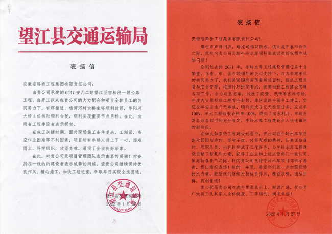 望江縣交通運(yùn)輸局的表?yè)P(yáng)信中指出,G347PPP項(xiàng)目自開(kāi)工以來(lái),在施工關(guān)鍵時(shí)期,面對(duì)現(xiàn)場(chǎng)施工條件復(fù)雜,工期緊,高空作業(yè)困難等不利因素,項(xiàng)目部全體參建人員上下一心,迎難而上,有序推進(jìn)楊灣河特大橋主塔順利封頂,華陽(yáng)河大橋主橋拱肋順利合龍,順利實(shí)現(xiàn)重要節(jié)點(diǎn)目標(biāo),對(duì)我公司及項(xiàng)目管理團(tuán)隊(duì)表示由衷的感謝,對(duì)奮戰(zhàn)在一線(xiàn)的建設(shè)者表示誠(chéng)摯的問(wèn)候,希望繼續(xù)加快工程進(jìn)度,爭(zhēng)取早日實(shí)現(xiàn)全線(xiàn)貫通。
