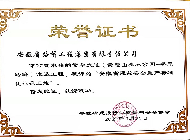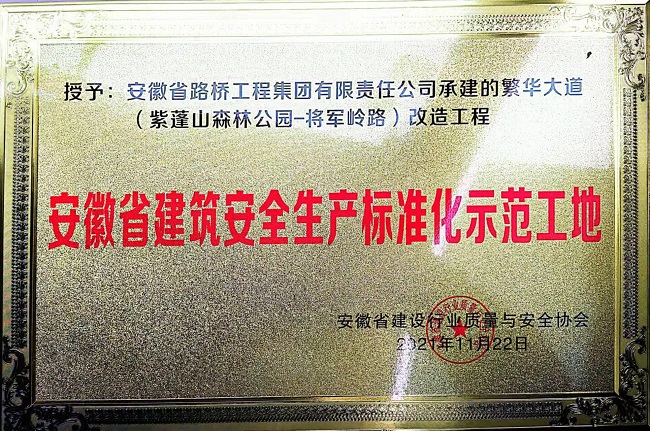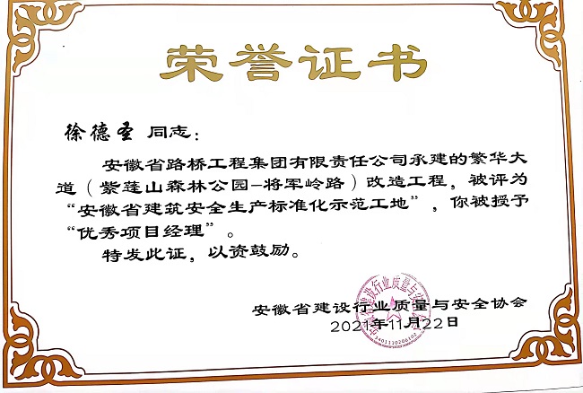 新春開門紅,喜報振人心。近日,繁華大道(紫蓬山森林公園-將軍嶺路)改造工程項目被評為“安徽省建筑安全生產(chǎn)標(biāo)準化示范工地”,徐德圣同志被授予“優(yōu)秀項目經(jīng)理”榮譽稱號。