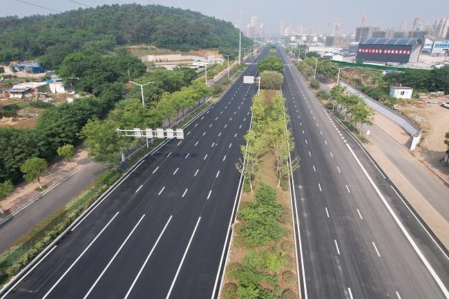 本次施工內容為慈湖河路至霍里山大道路段全幅機動車道瀝青上面層攤鋪,此路段總長1.8公里,兩幅寬各12米,總攤鋪面積43200平方米。