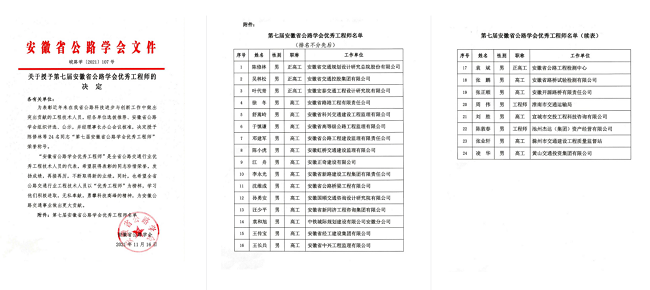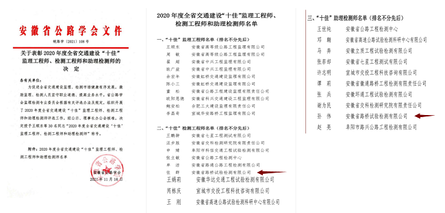 安徽省交通建設“十佳”檢測工程師、安徽省交通建設“十佳”助理檢測師評選活動每年評選一次,優秀工程師每兩年評選一次,由安徽省公路學會層層嚴格審核評定,具有較高的行業權威性和公信力。