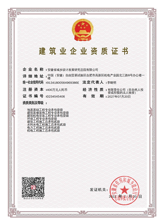 7月19日,城鄉(xiāng)設計總院增項獲批環(huán)境衛(wèi)生工程設計乙級資質(zhì),7月22日再獲裝修裝飾工程、建筑機電工程專業(yè)承包一級、電力工程總承包二級資質(zhì),施工類別資質(zhì)已達八項。