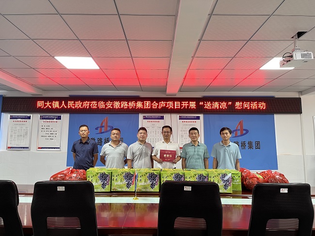 在送達(dá)感謝信的同時(shí),同大鎮(zhèn)人民政府工作人員還攜帶西瓜、葡萄等時(shí)令水果,開(kāi)展防暑降溫“送清涼”慰問(wèn)活動(dòng),為奮戰(zhàn)在施工一線的路橋集團(tuán)建設(shè)者加油鼓勁。