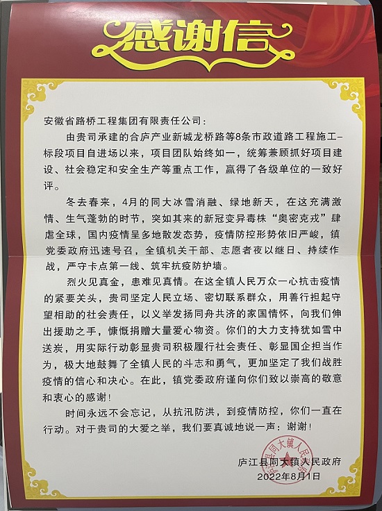 8月2日下午,同大鎮(zhèn)人民政府向路橋集團(tuán)合廬產(chǎn)業(yè)新城項(xiàng)目送來(lái)感謝信,以表達(dá)對(duì)疫情防控嚴(yán)峻形勢(shì)下,項(xiàng)目統(tǒng)籌兼顧抓好施工建設(shè)、社會(huì)穩(wěn)定和安全生產(chǎn)等重點(diǎn)工作,積極履行社會(huì)責(zé)任的感謝!
