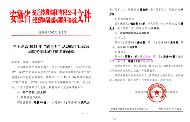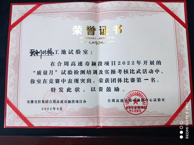 2022年9月份,安徽交控集團(tuán)合周高速壽潁段項(xiàng)目辦舉辦2022年“質(zhì)量月”試驗(yàn)檢測培訓(xùn)及實(shí)操考核比武活動(dòng),安徽省路橋試驗(yàn)檢測有限公司合周高速壽潁預(yù)制01標(biāo)工地試驗(yàn)室在技能比武中表現(xiàn)突出,榮獲團(tuán)體比賽第一名。