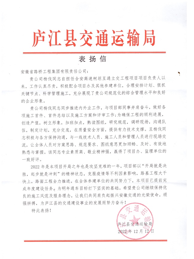近日,合肥市廬江縣交通運輸局向路橋集團發來表揚信,對合安高速柯坦互通項目在建設中展現出的科學管理、國企擔當及項目班子建設給予高度肯定和表揚。