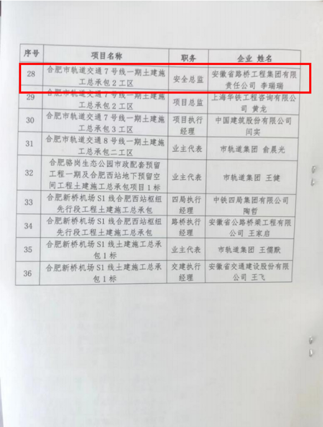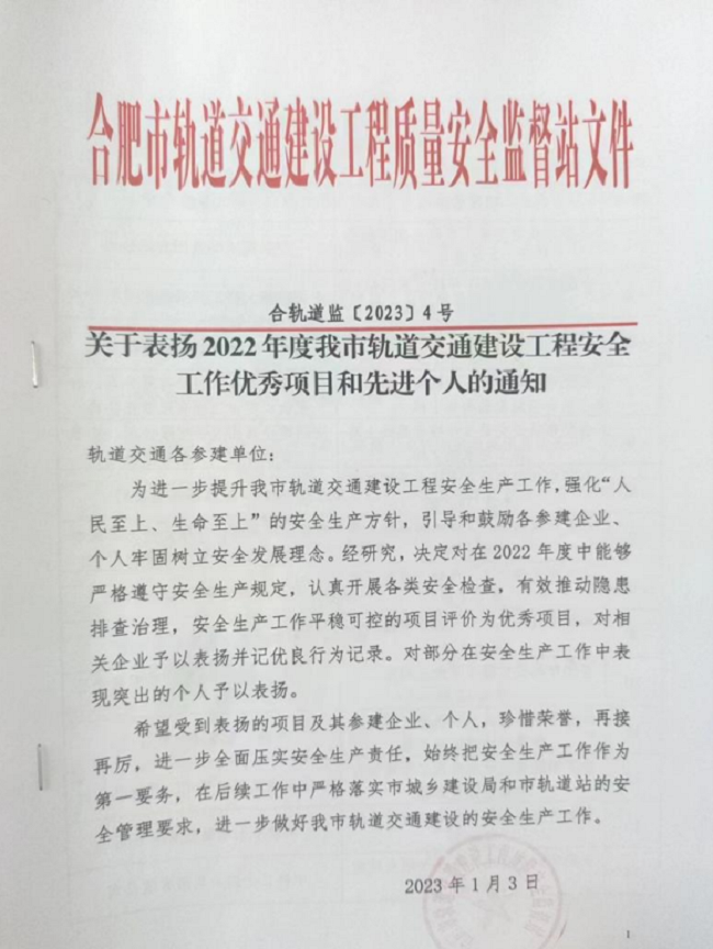 近日,安徽路橋集團(tuán)承建的合肥市軌道交通7號線(二工區(qū))項目榮獲2022年度合肥市軌道交通建設(shè)工程安全工作優(yōu)秀項目,項目安全總監(jiān)李瑞瑞獲安全工作先進(jìn)個人。