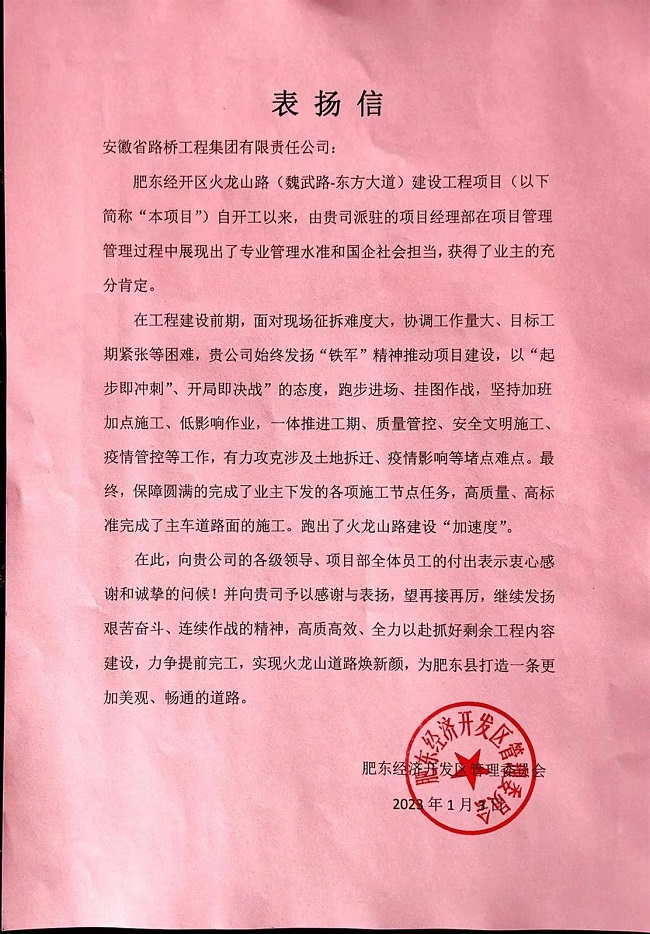 肥東經濟開發區管理委員會發來的表揚信指出,肥東經開區火龍山路項目自開工以來,由我司派駐的項目經理部始終以“鐵軍”精神推動項目建設,用“起步即沖刺”、開局即決戰”的態度,跑步進場、掛圖作戰,堅持加班加點施工、低影響作業,一體推進工期、質量管控、安全文明施工、疫情管控等工作,有力攻克土地拆遷、疫情等堵點難點。最終,圓滿完成業主下發的各項施工節點任務,高質量、高標準完成主車道路面的施工,跑出火龍山路建設“加速度”,在項目管理管理過程中展現出了專業管理水準和國企社會擔當,獲得了業主的充分肯定。為此特對我公司各級領導、項目部全體員工的付出表示感謝與表揚,希望項目部再接再厲,繼續發揚艱苦奮斗、連續作戰的精神,高質高效、全力以赴抓好剩余工程內容建設,力爭提前完工,實現火龍山道路換新顏,為肥東縣打造一條更加美觀、暢通的道路。