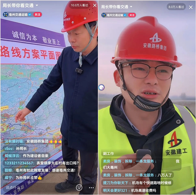 孫善豹一行先后來到立德樞紐、機場互通施工現(xiàn)場,以火熱的大干場面為背景,向廣大網(wǎng)友詳細(xì)介紹了亳蒙高速項目規(guī)劃設(shè)計、建設(shè)進度、現(xiàn)場管理等情況。在直播過程中,安徽路橋集團亳蒙高速項目負(fù)責(zé)人圍繞關(guān)鍵控制節(jié)點、成果進展等項目建設(shè)專業(yè)問題,與網(wǎng)友親切互動交流,答疑解惑,氣氛和諧融洽。