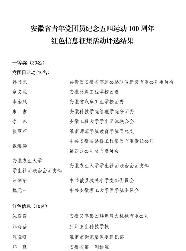 9月18日,安徽先鋒網(wǎng)、安徽共青團(tuán)網(wǎng)公布“五四運(yùn)動(dòng)100周年”紅色信息征集評(píng)選活動(dòng)獲獎(jiǎng)名單,池祁項(xiàng)目“弘揚(yáng)五四精神,凝聚青春力量”主題黨團(tuán)活動(dòng)榮獲黨團(tuán)日活動(dòng)類一等獎(jiǎng)。