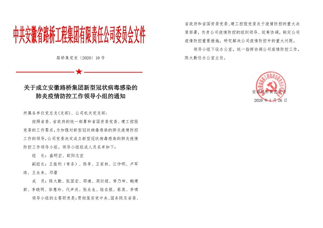 一個支部就是一座堡壘,一個黨員就是一面旗幟。連日來,面對嚴(yán)峻的疫情形勢,安徽路橋集團堅決貫徹上級黨組織各項決策部署,組織動員基層黨支部和廣大黨員干部把打贏疫情防控阻擊戰(zhàn)作為當(dāng)前的重大政治任務(wù),讓黨旗在抗擊疫情的一線高高飄揚。