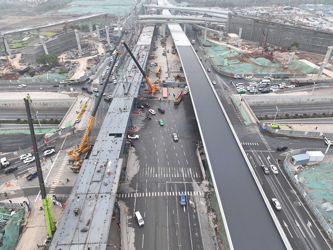此次吊裝的Y6聯(lián)鋼箱梁設(shè)計為55米+80米+55米跨徑,總長190米,共60片梁,重約2800噸。項目自春節(jié)復(fù)工以來,統(tǒng)籌規(guī)劃,不斷攻堅克難,克服了地下管線復(fù)雜、供電遷改難度大、交口交通流量極大、互通立交交叉施工工序多等困難,當(dāng)前,全體參建人員鉚足干勁,合力攻堅,正在有序推薦互通匝道橋梁及跨機場高速橋梁等重要節(jié)點,力爭10月1日全線通車。