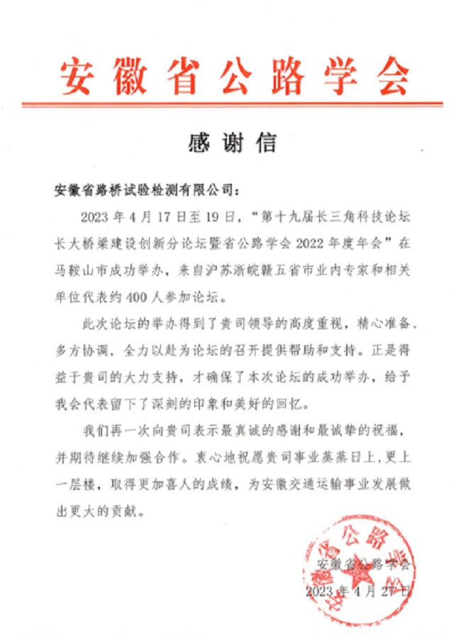 2023年4月28日,檢測(cè)公司收到安徽省公路學(xué)會(huì)發(fā)來的感謝信。