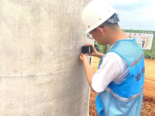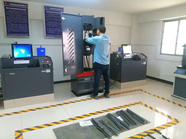 宣涇高速中心試驗室人員分別正在對立柱進行碳化深度檢測、對鋼筋原材進行拉伸試驗