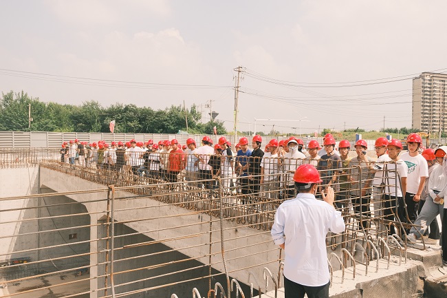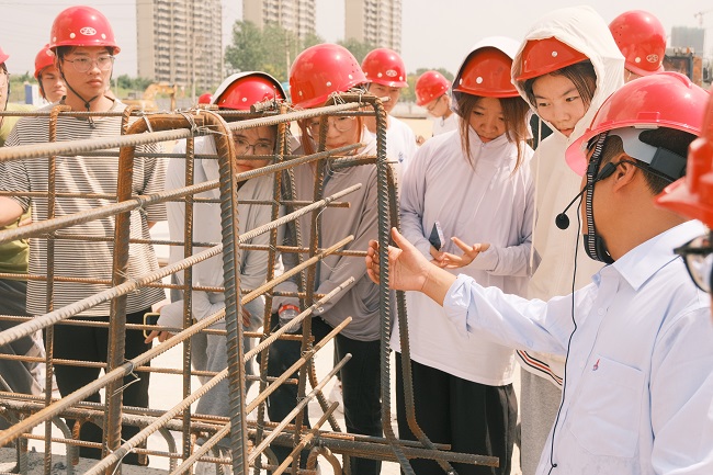 在項目負責人的帶領下,安徽理工大學師生一行深入項目西城大道下穿施工現場,實地了解深基坑開挖、支護、防水等施工工藝和深基坑開挖、滿堂支架等危大工程的控制要點及大臨結構中關于材料用量的優化措施。通過實地觀摩,學生們對工程施工工序及BIM技術在項目中的實踐運用有了更加直觀的認識。學生們紛紛表示,這樣的現場“零距離”觀摩,不僅印證課堂所學知識,還對現場施工有了更深層次的認識,為自己接下來專業學習帶來很大幫助,也對建工建投集團有了更清晰的了解。