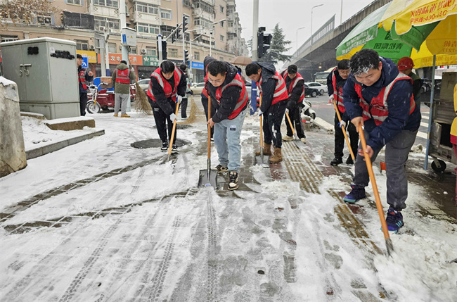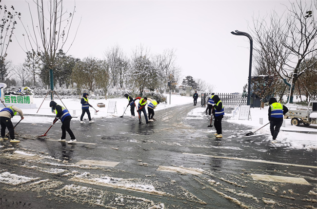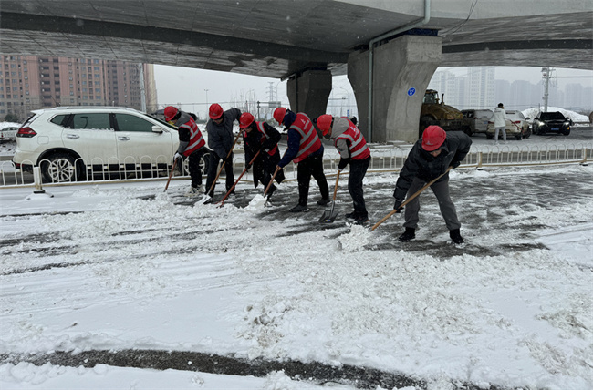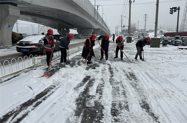 ▲青海路項目由項目經理帶隊,發動項目班子及普通員工共17人,使用鐵鍬、掃把、融雪鹽,為青海路撒鹽鏟雪,有效保障了行車安全,為園博園入園觀賞的游客提供安全保障。