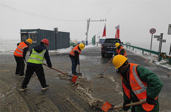 項目員工不畏嚴寒,團結協作,揮舞著鐵鍬和掃帚對路面積雪進行清掃,對施工大轉盤、脊嶺頭、道路主干道、上下坡等重點部位撒布工業鹽。截至18日中午,共出動車輛4部,人員30余人,撒布工業鹽30余袋。