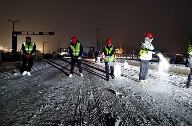 面對寒潮降雪天氣,項(xiàng)目部“以雪為令”,迅速啟動惡劣天氣應(yīng)急預(yù)案,全面開展除積雪工作,全力為群眾出行安全、道路暢通保駕護(hù)航。通過科學(xué)分工,明確任務(wù),管理人員對施工現(xiàn)場、生活區(qū)、辦公區(qū)等進(jìn)行了全方位檢查,尤其是對施工區(qū)的鋼筋大棚以及各平交路口等重點(diǎn)部位進(jìn)行了詳細(xì)的安全排查。項(xiàng)目員工在施工道路改三橋(K8天橋、金梅路跨206天橋、K12天橋)進(jìn)行了撒鹽解凍和積雪鏟除等工作,在重點(diǎn)路段加強(qiáng)巡邏管控,引導(dǎo)車輛減速慢行,確保道路總體通暢。