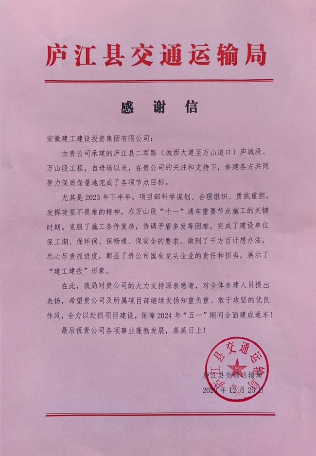 感謝信是業(yè)主對項目部的認(rèn)可與肯定,更是揚帆起航的風(fēng)向!2024年,廬江二軍路項目部將再接再厲,繼續(xù)發(fā)揮敢打硬戰(zhàn)、能打勝戰(zhàn)的工作作風(fēng),為廬江縣建設(shè)一條康莊大道。