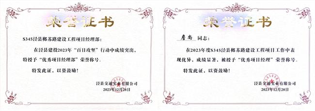 為此,業(yè)主單位授予S345涇縣榔蘇路項(xiàng)目“優(yōu)秀項(xiàng)目經(jīng)理部”稱號,授予項(xiàng)目經(jīng)理詹尚“優(yōu)秀項(xiàng)目經(jīng)理”稱號。